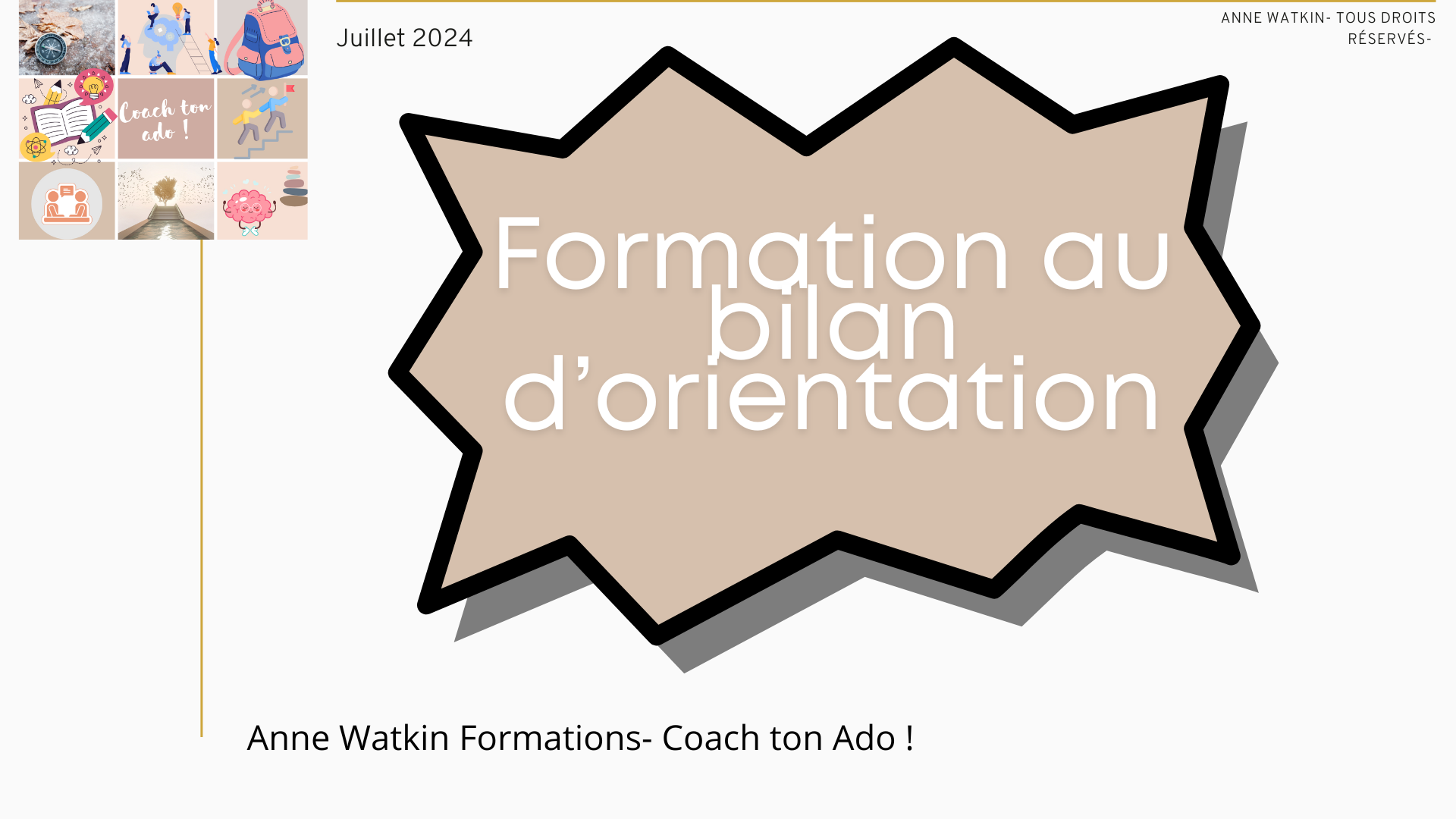 Je vous propose donc une formation aux bilans d’orientation. Cette formation est réservée aux enseignants car il y a de nombreux aspects du système éducatif qui ne seront pas abordés. Pour les non-enseignants, j’anime une autre formation, plus large, plus longue (80 heures), vous pouvez me contacter, je vous donnerai les coordonnées de l’organisme.